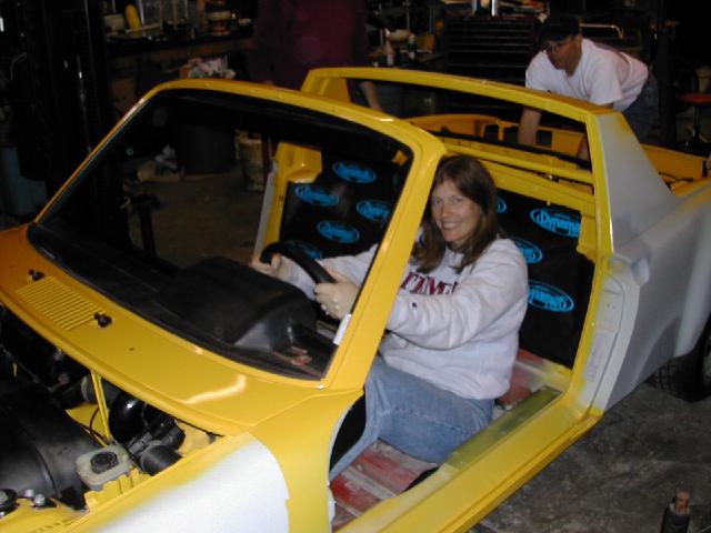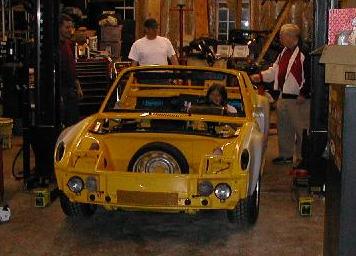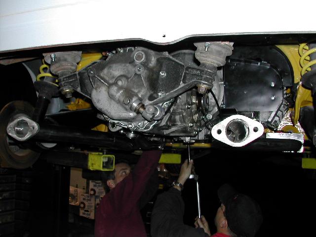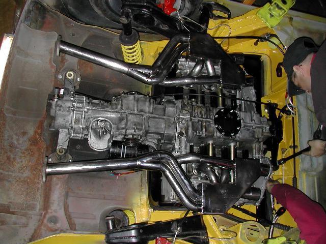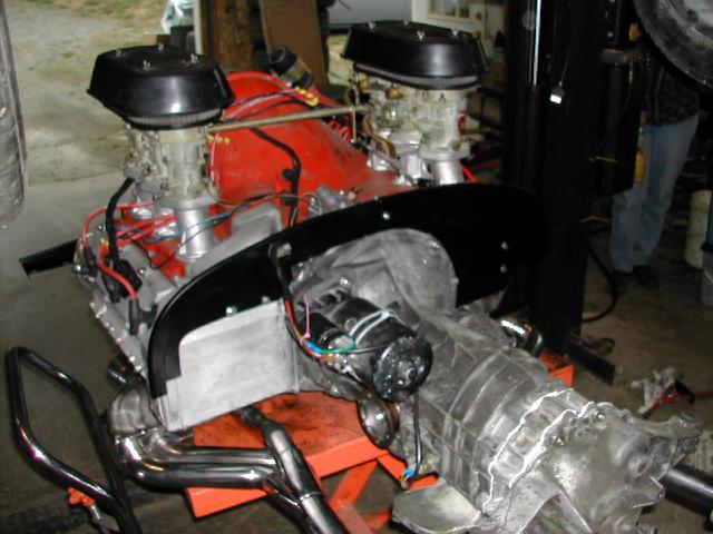 Next the engine is carefull raised into the awaiting chassis, prepared by jeff Brubaker.